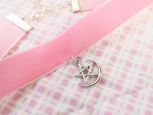 Pentagram Moon Grunge Pagan Goth Pink Velvet Choker